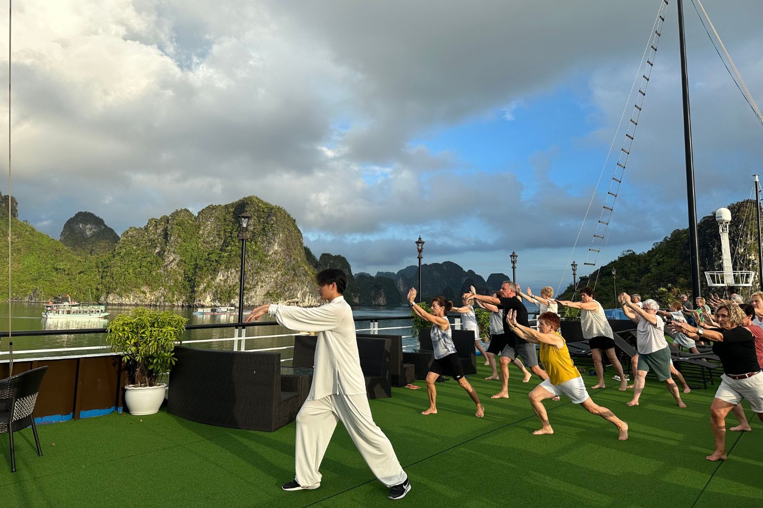 A la salida del sol y para aquellos que estén interesados hay una clase de Tai Chi en la terraza solárium. Poco después, te servirá un desayuno ligero a bordo.